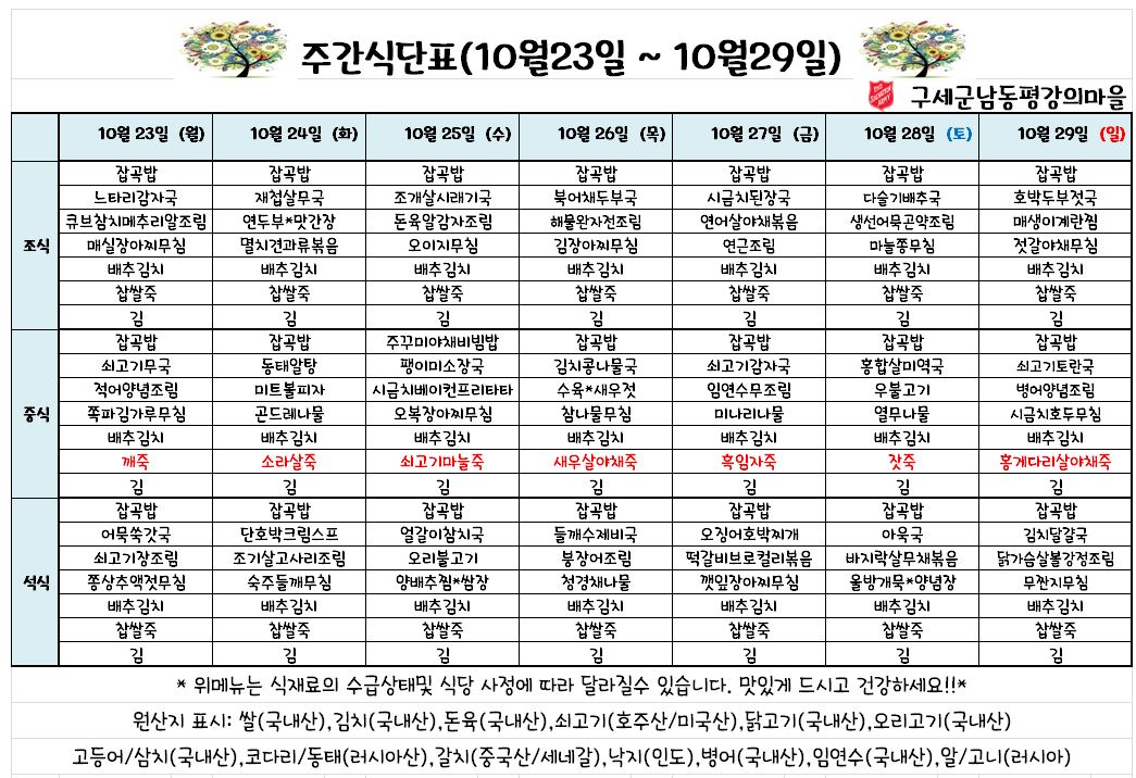 평강가족 > 자유게시판 > 10월 4째주 식단표 입니다.