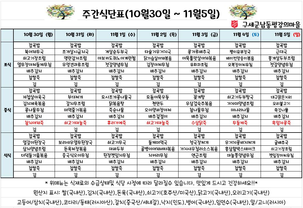 평강가족 > 자유게시판 > 11월 1째주 식단표 입니다.