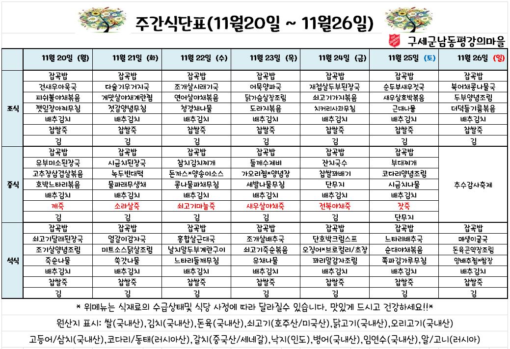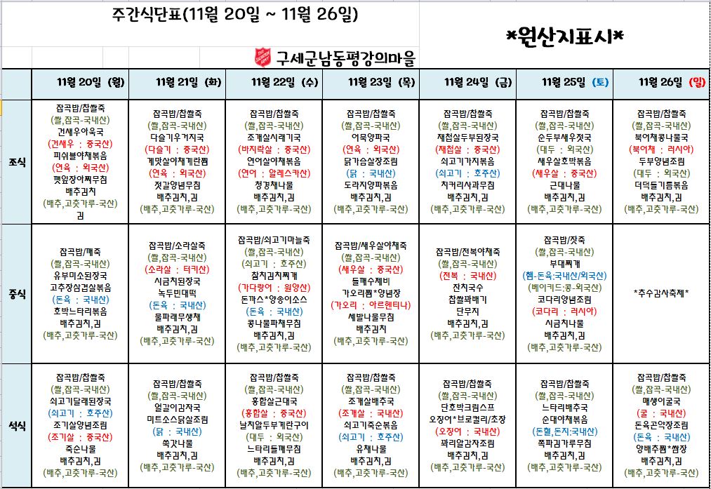 평강가족 > 자유게시판 > 11월 4째주 식단표 입니다.