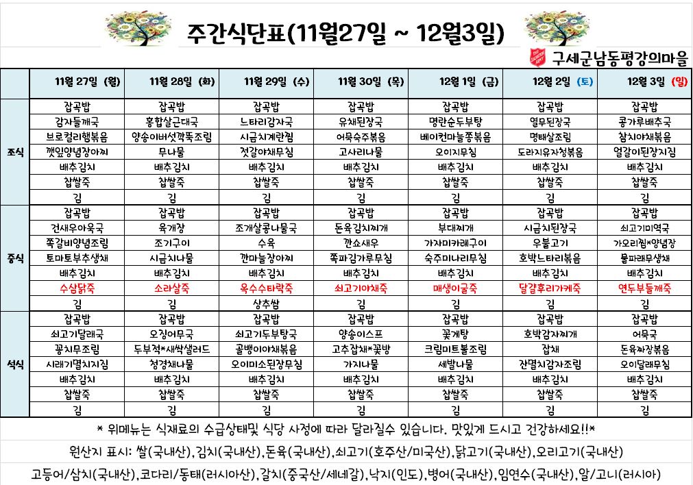 평강가족 > 자유게시판 > 11월 5째주 식단표 입니다.