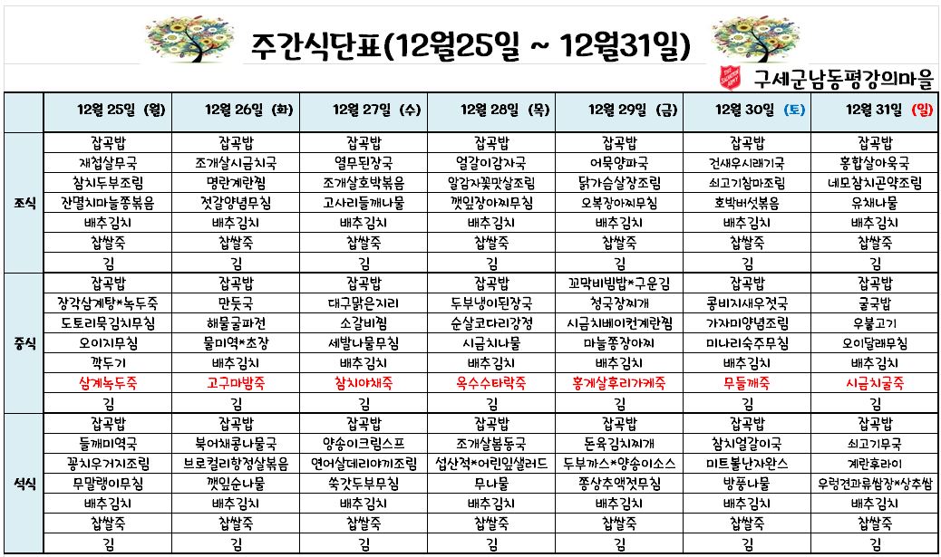 평강가족 > 자유게시판 > 12월 5째주 식단표 입니다.