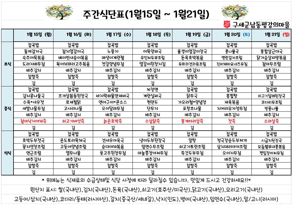 평강가족 > 자유게시판 > 1월 3째주 식단표 입니다.