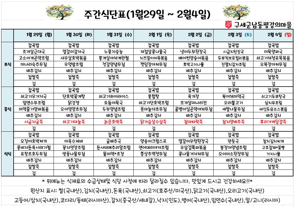 평강가족 > 자유게시판 > 2월 첫째주 식단표 입니다.