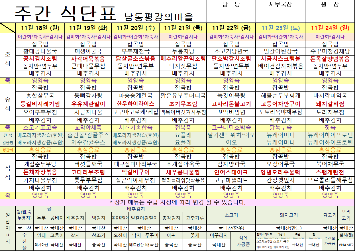평강가족 > 자유게시판 > 11월 셋째주 식단입니다.