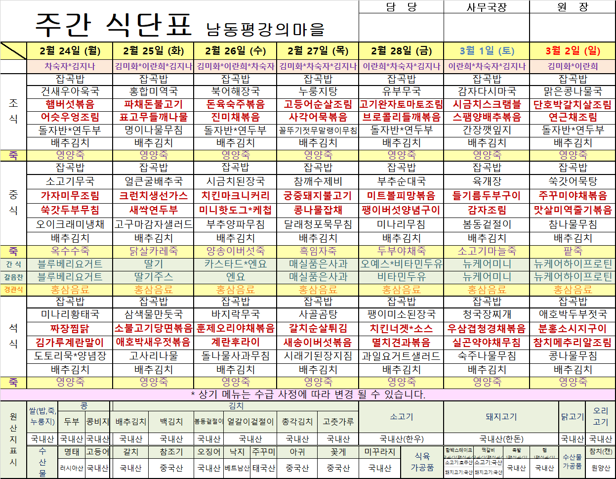 평강가족 > 자유게시판 > 2월 넷째주 식단입니다.
