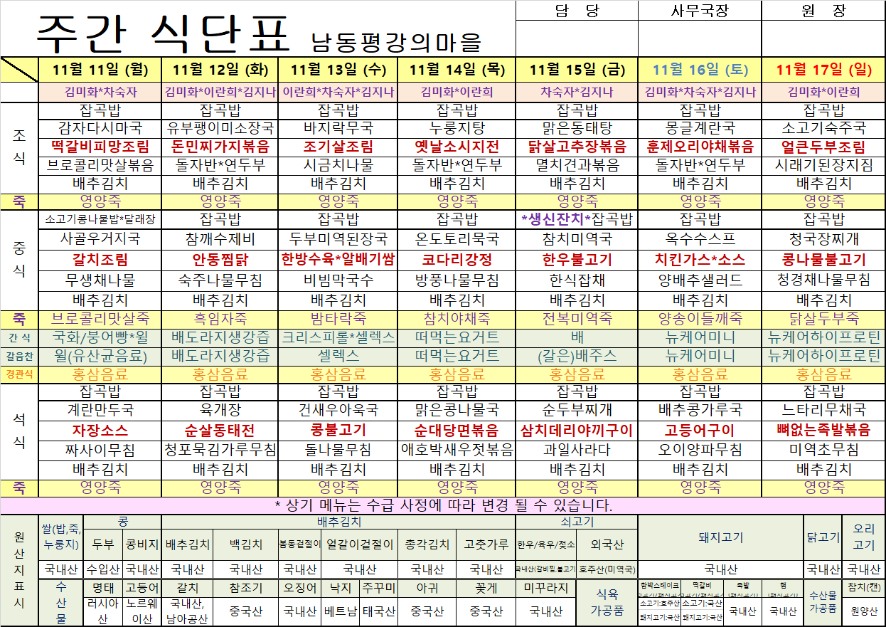 평강가족 > 자유게시판 > 11월 둘째주 식단입니다.