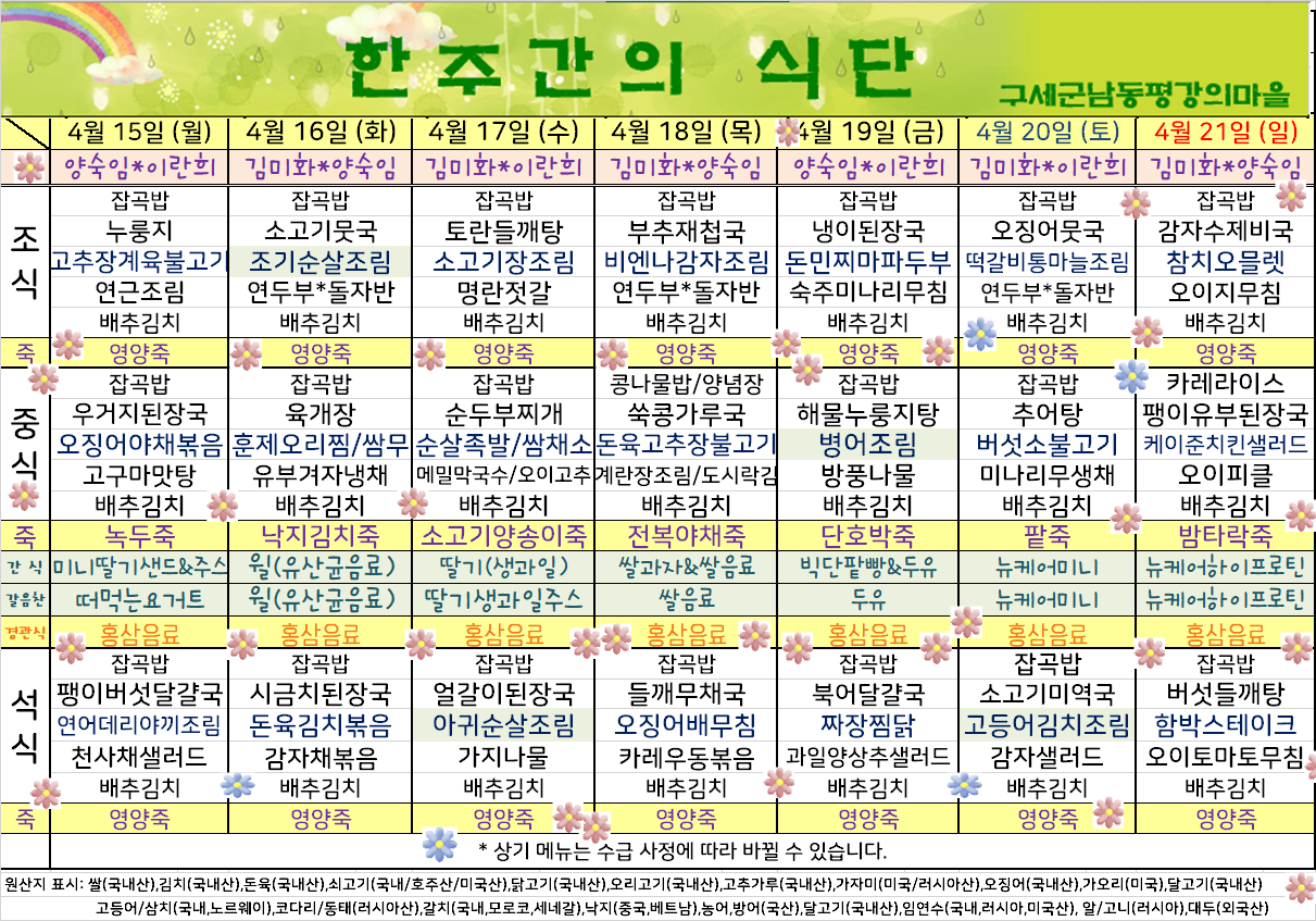 평강가족 > 자유게시판 > 4월 셋째주 식단표입니다.