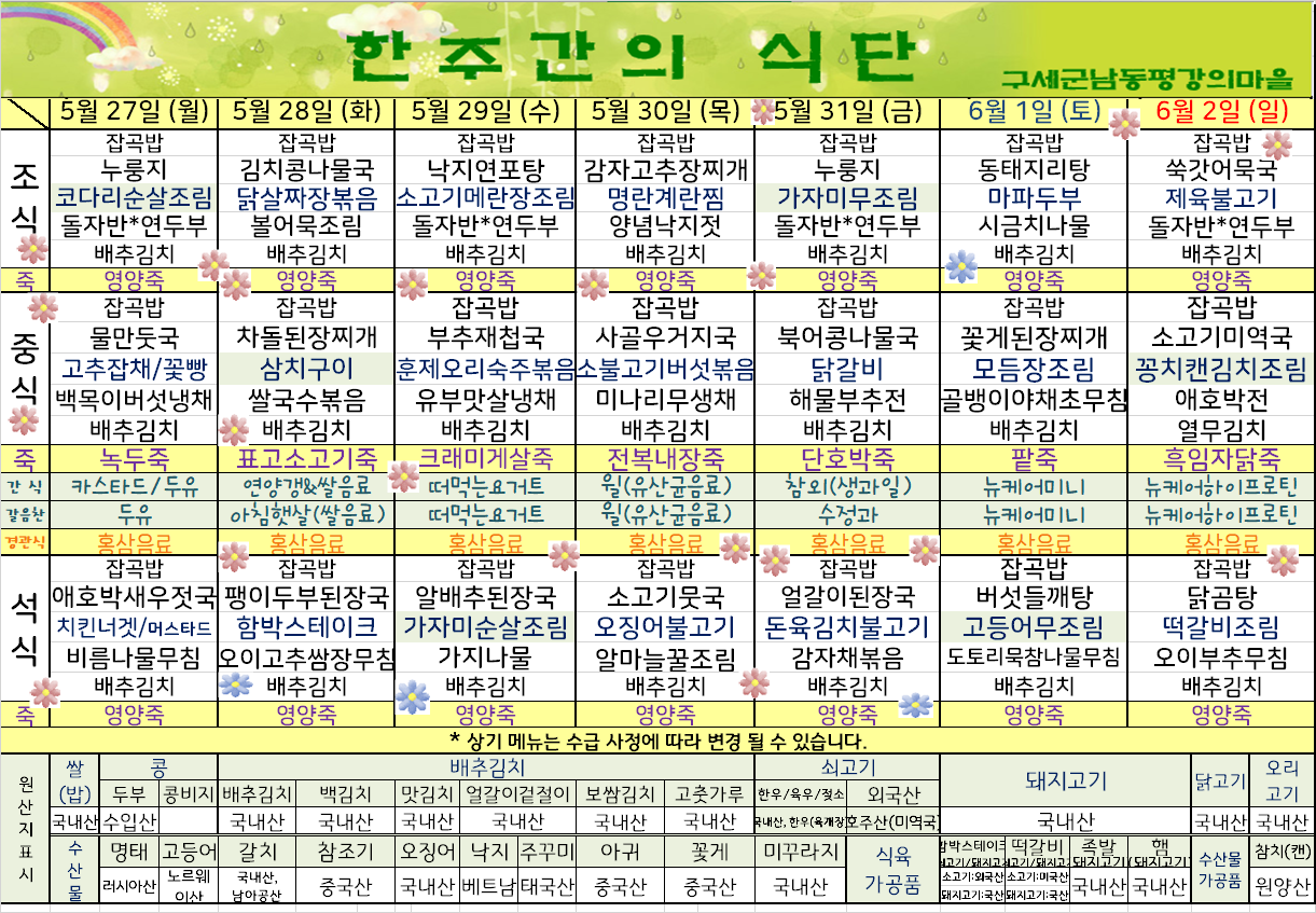 평강가족 > 자유게시판 > 6월 첫째주 식단표입니다.