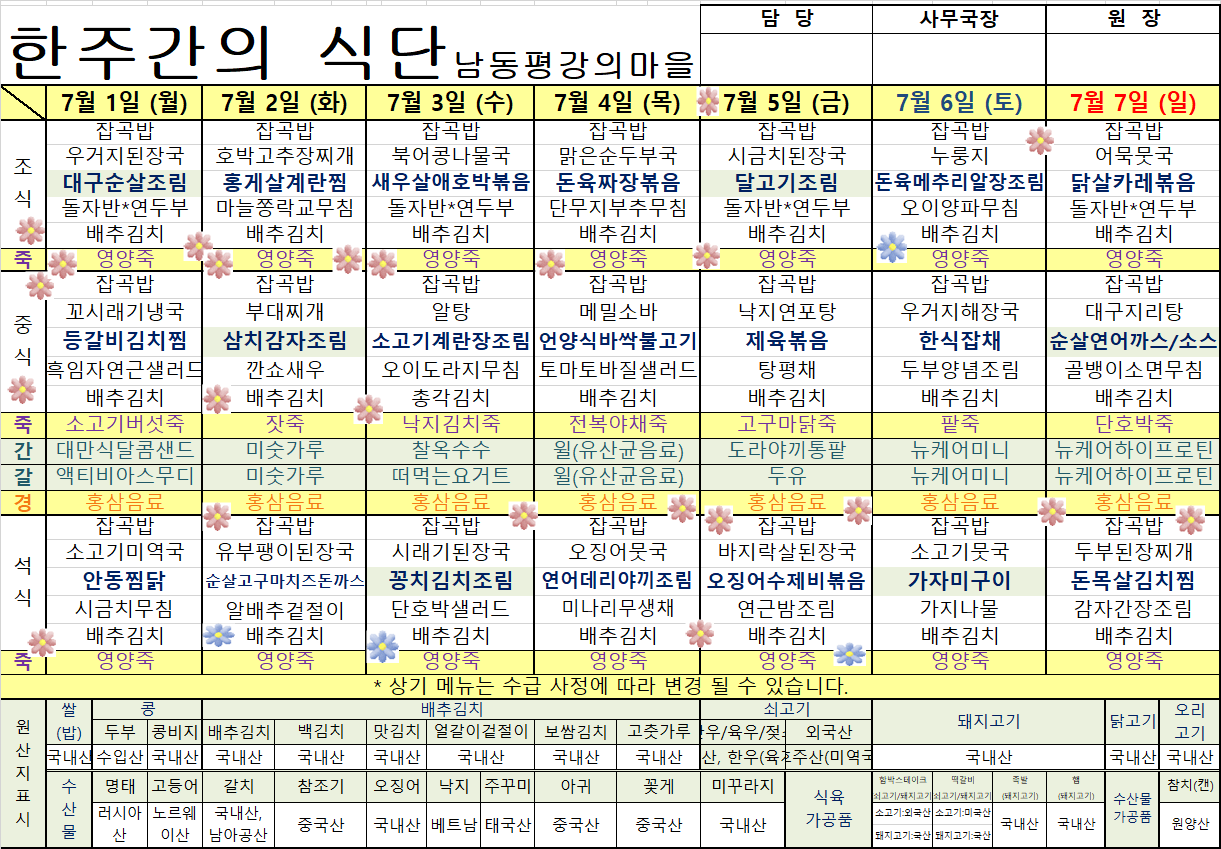 평강가족 > 자유게시판 > 7월 첫째주 식단표입니다.