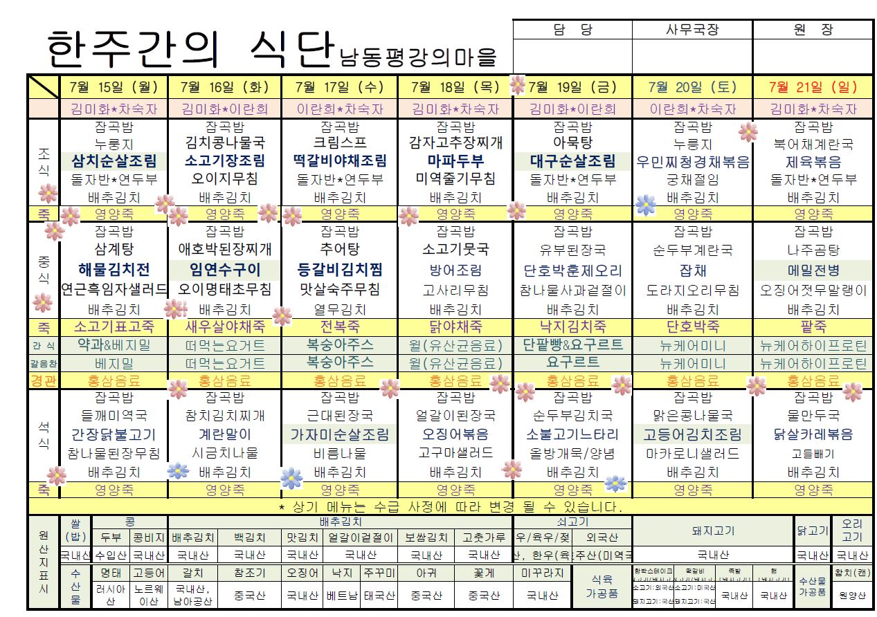 평강가족 > 자유게시판 > 7월 셋째주 식단입니다.