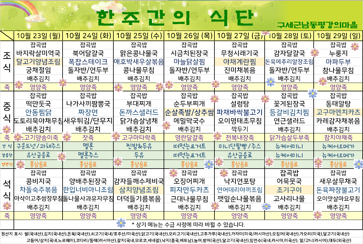 평강가족 > 자유게시판 > 10월 넷째주 식단입니다.