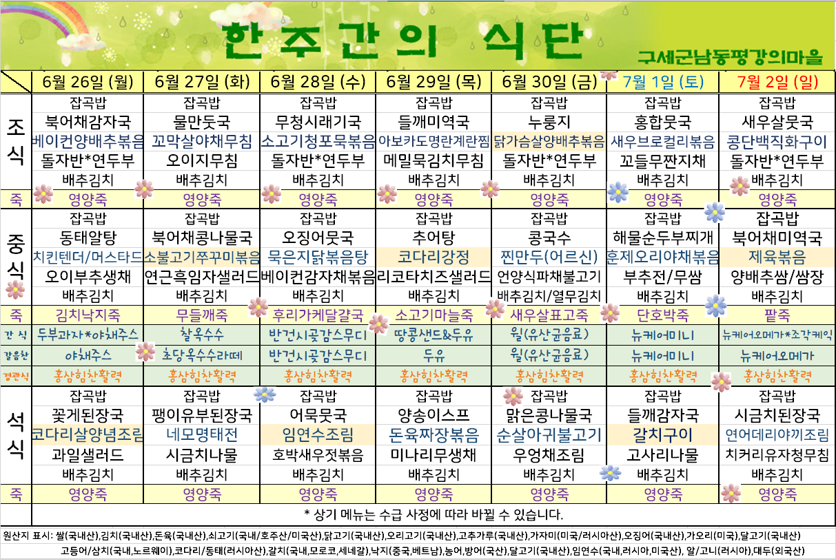 평강가족 > 자유게시판 > 6월 마지막째주 식단표입니다.