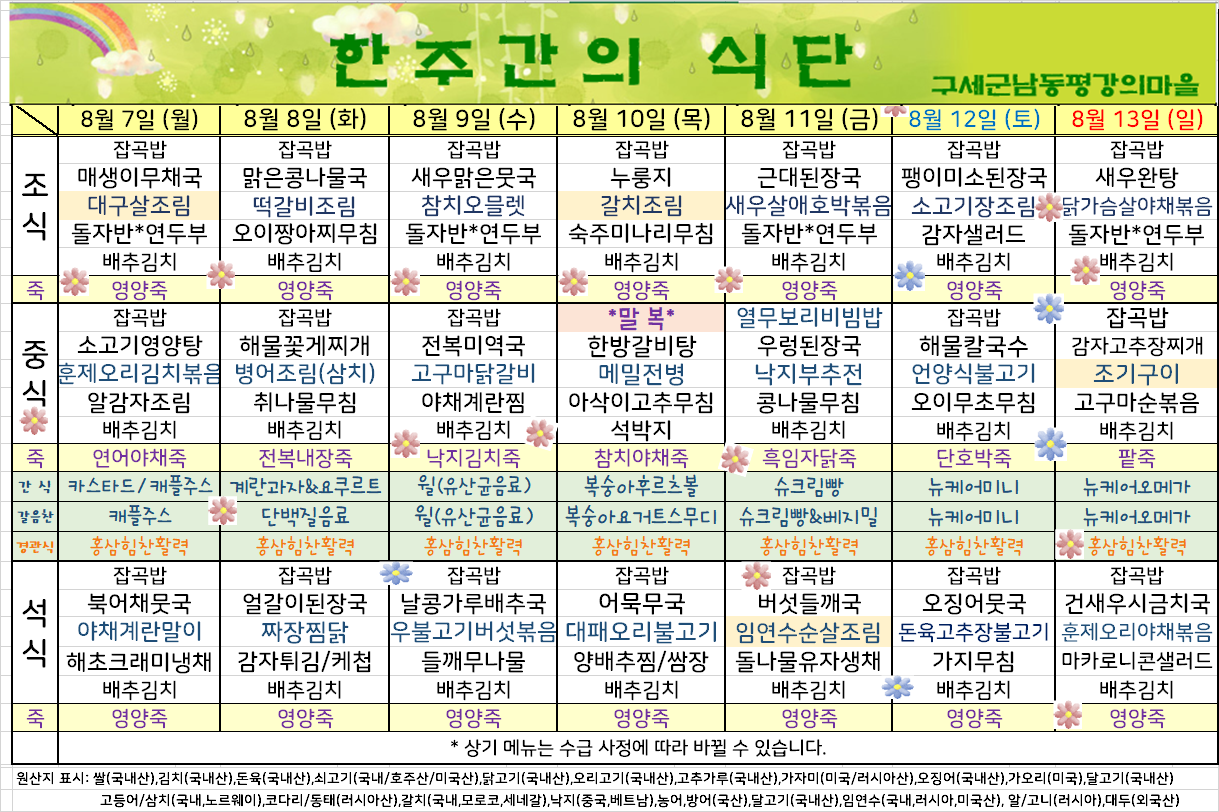 평강가족 > 자유게시판 > 8월 둘째주 식단표입니다.