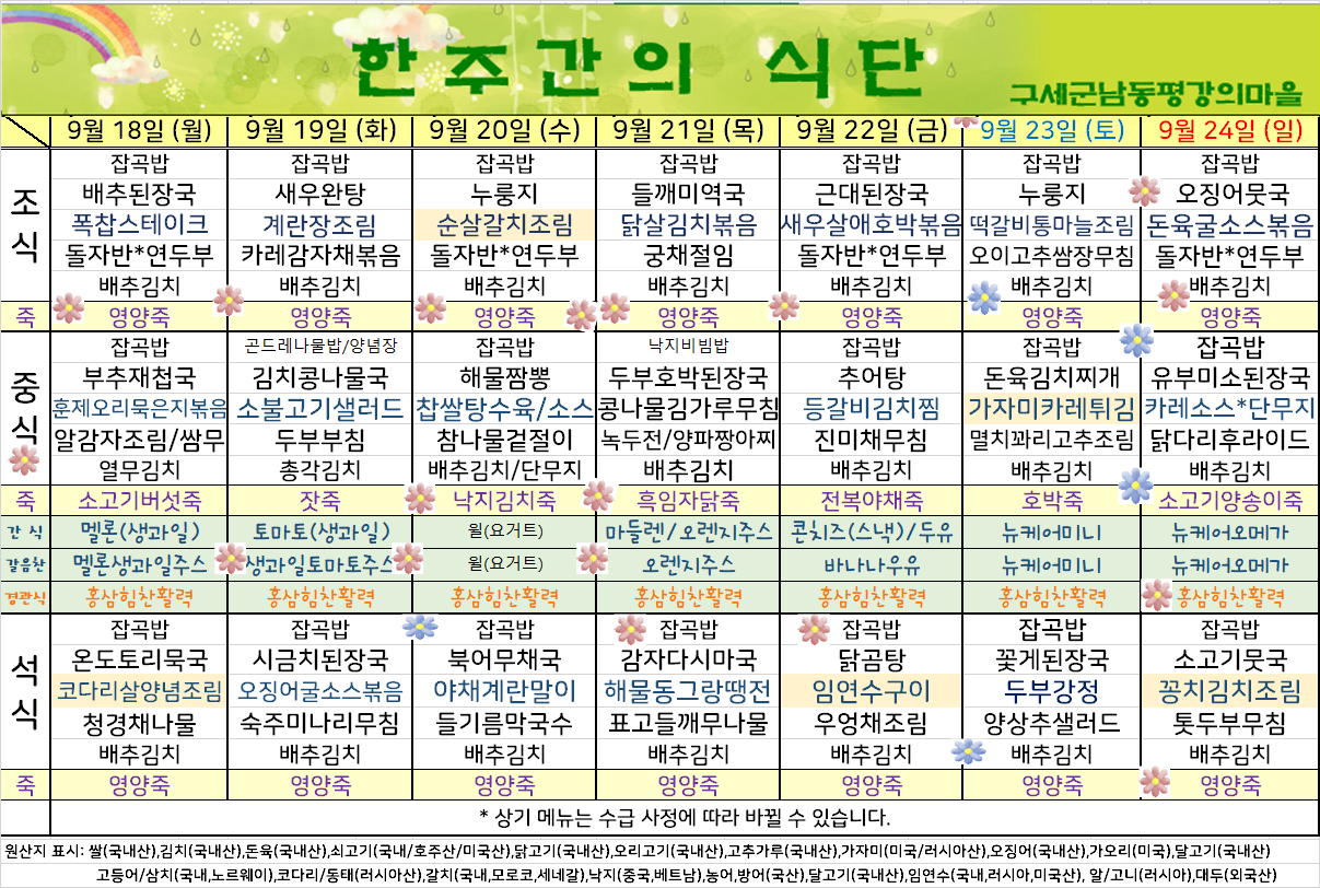 평강가족 > 자유게시판 > 9월 셋째주 식단표입니다.