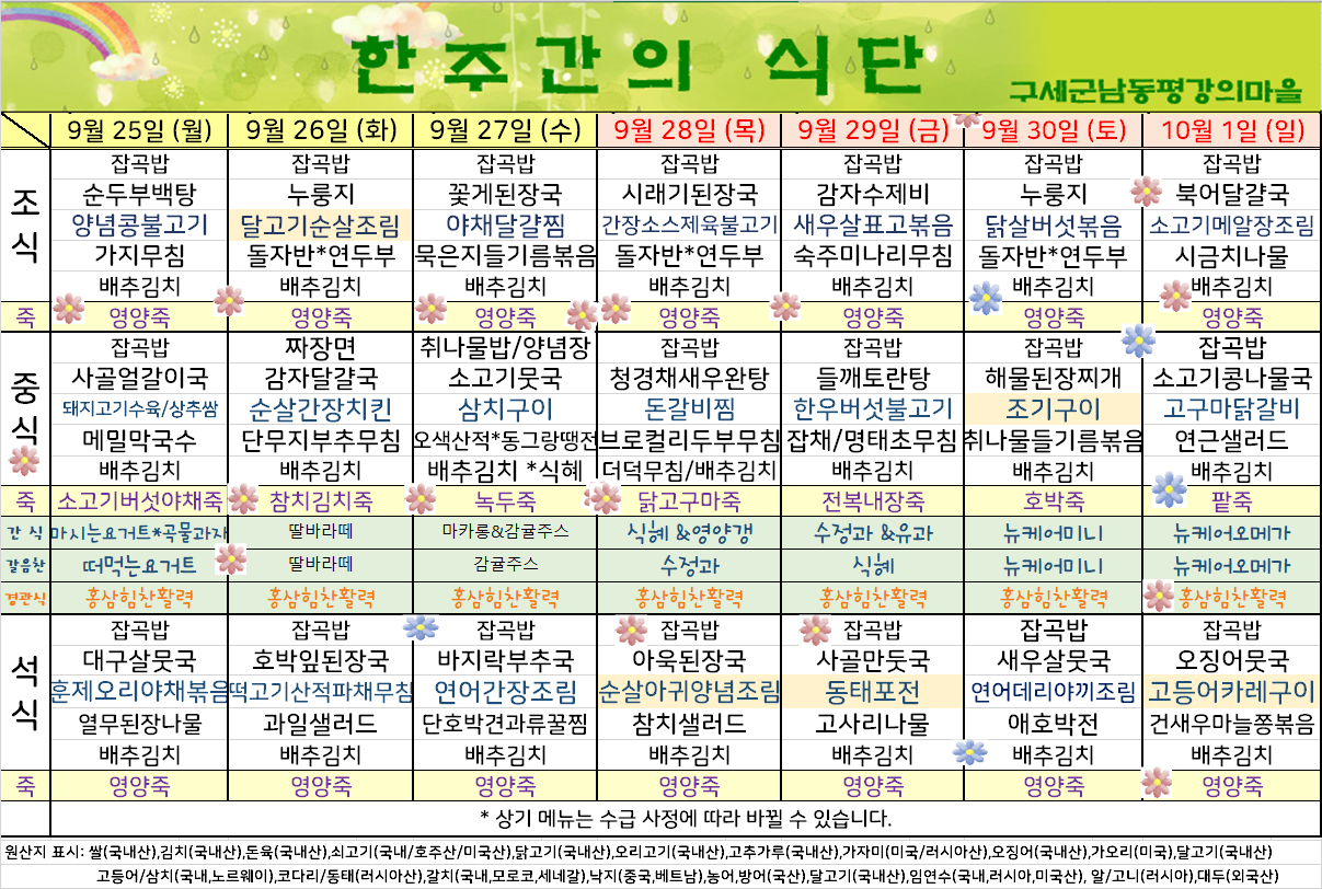 평강가족 > 자유게시판 > 9월 넷째주 식단표입니다.