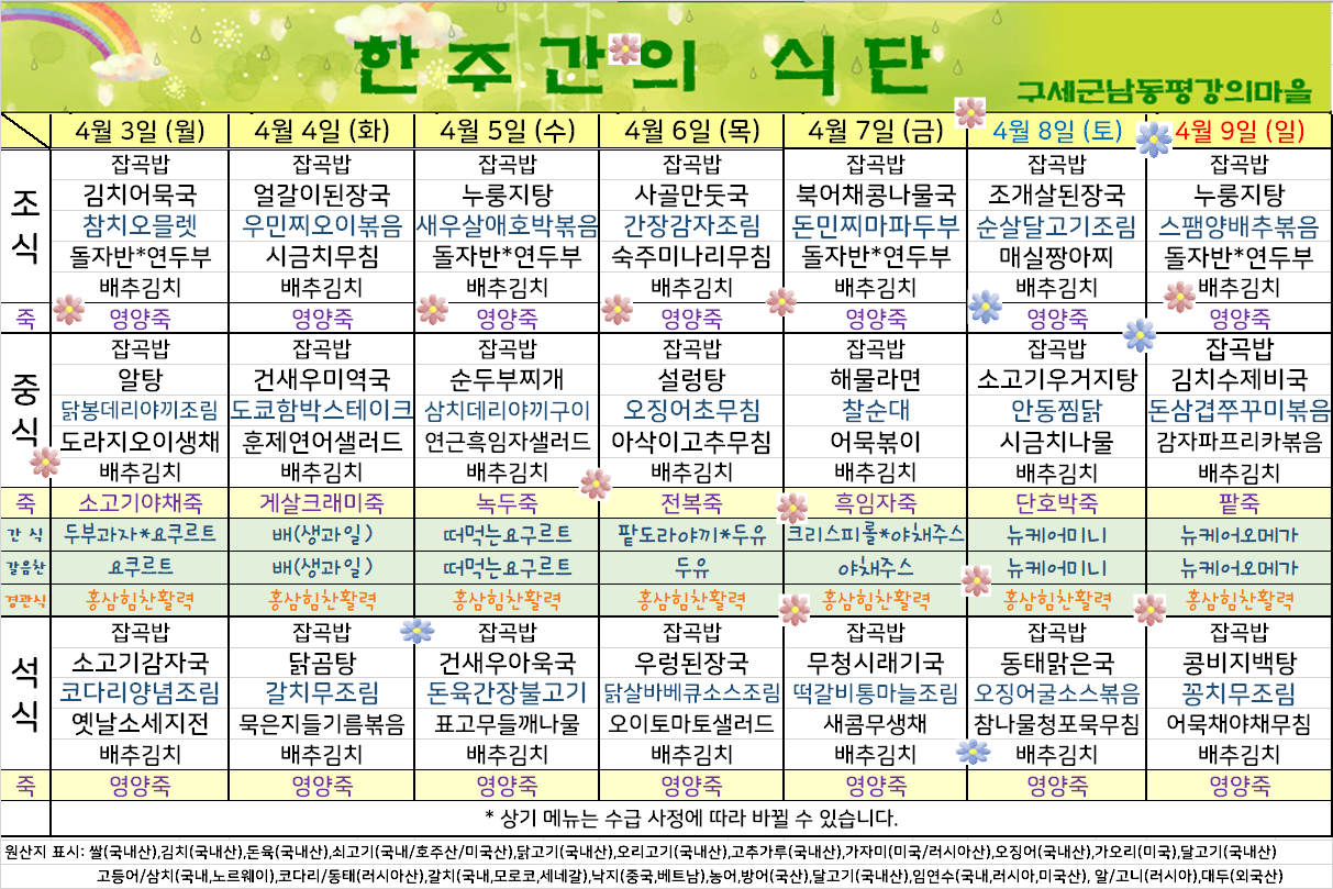 평강가족 > 자유게시판 > 4월 첫째주 식단입니다.