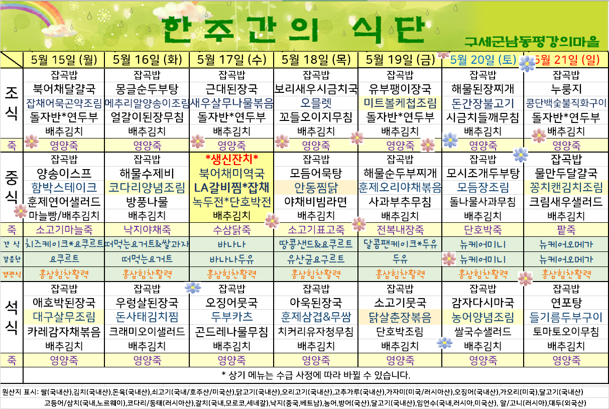 평강가족 > 자유게시판 > 5월 셋째주 식단입니다.