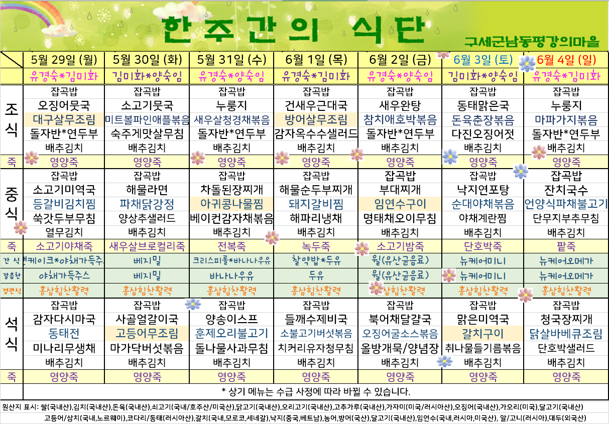 평강가족 > 자유게시판 > 5월 마지막째주 식단표입니다.