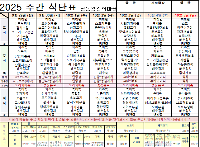 평강가족 > 자유게시판 > 9월 다섯째주 식단입니다.