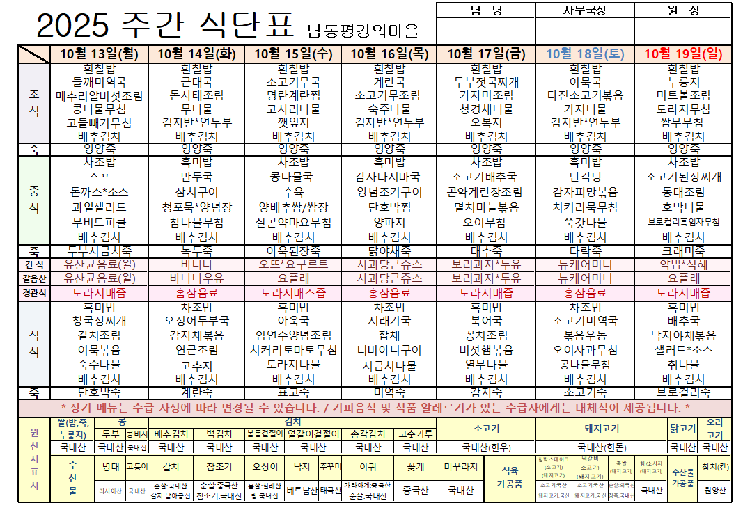 평강가족 > 자유게시판 > 10월 둘째주 식단입니다.