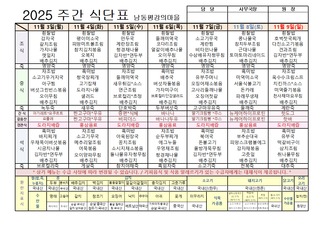 평강가족 > 자유게시판 > 11월 첫째주 식단입니다.