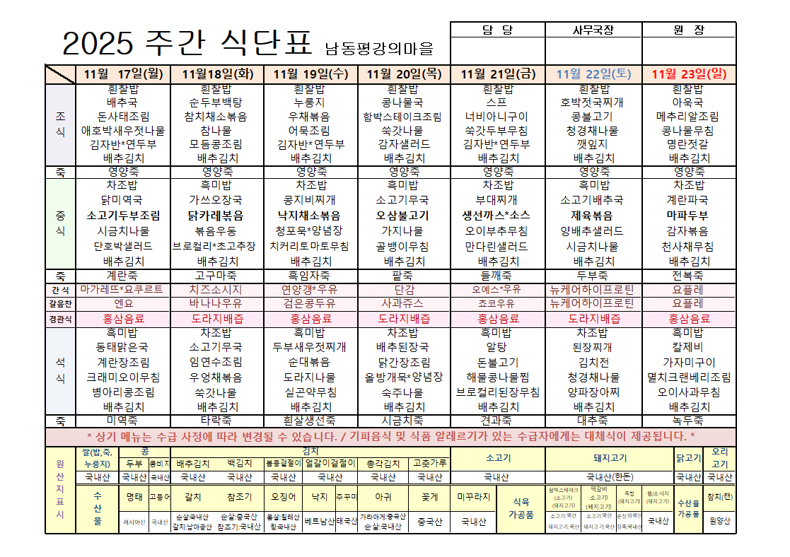 평강가족 > 자유게시판 > 11월 셋째주 식단입니다.