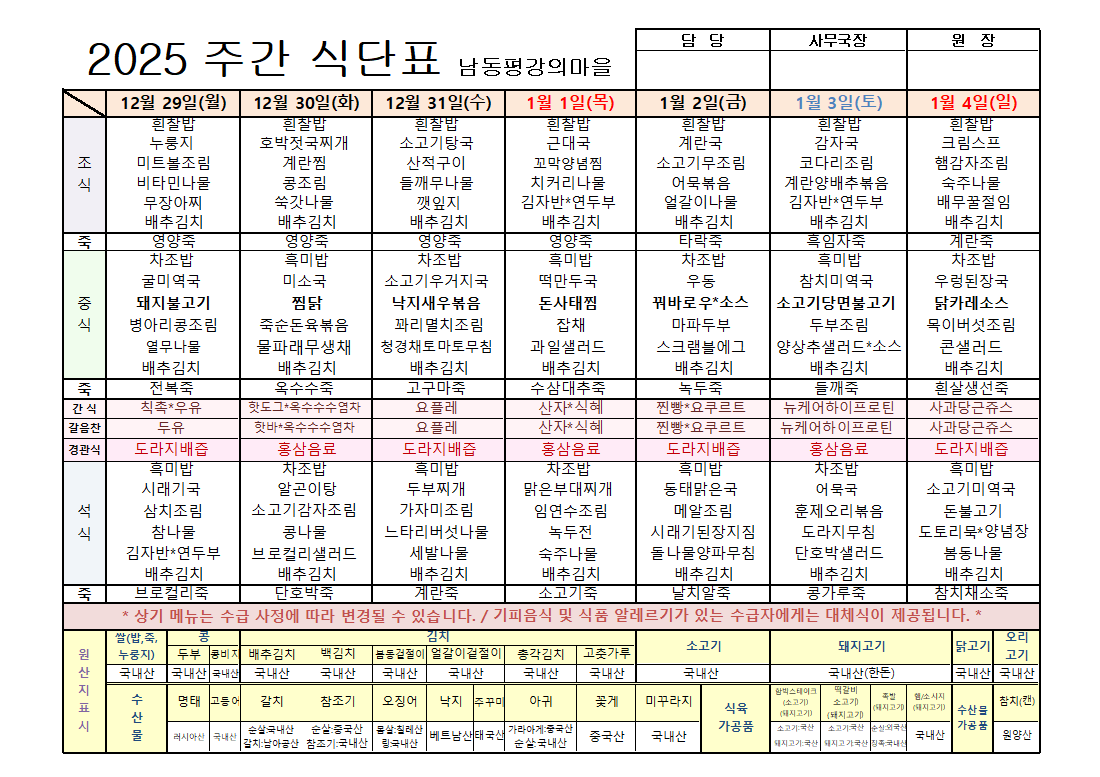 평강가족 > 자유게시판 > (2026) 1월 첫째주 식단입니다.